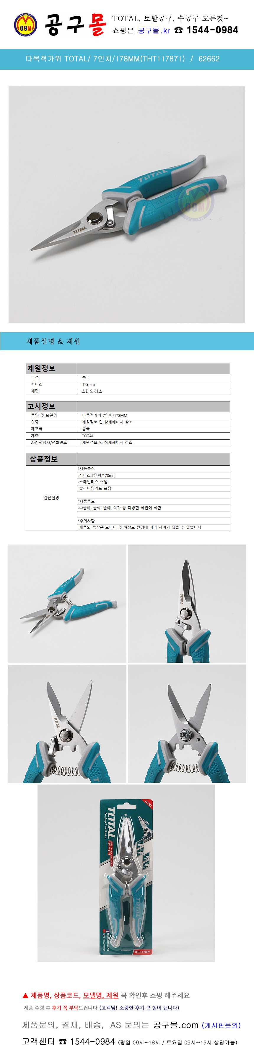 다목적가위 178MM (THT117871) TOTAL, 철판가위, 다용도가위, 공구몰, 62662