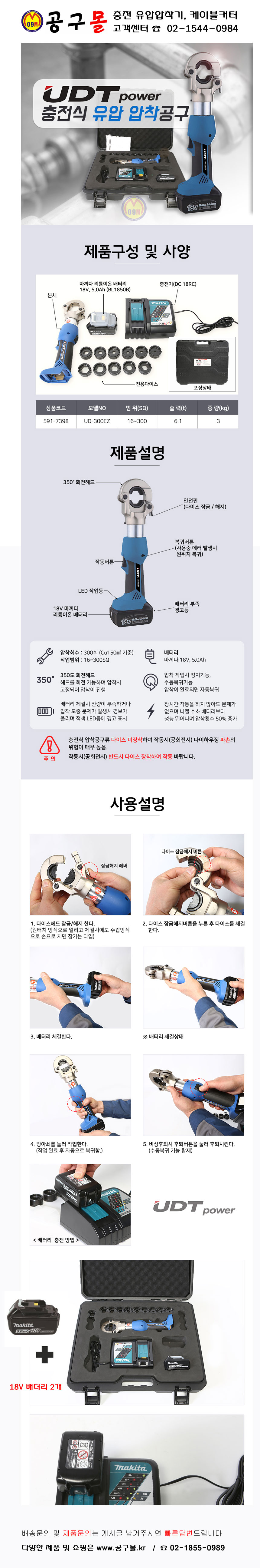 UDT 충전식 유압압착공구 UD-300EZ(18V2팩) UDT충전유압, UD300EZ, 5936843, 공구몰,593-6843