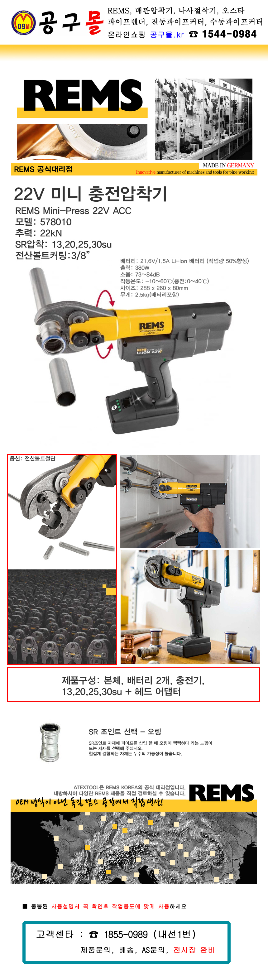 품절,렘스 미니프레스 22V 풀세트 D1 578050 R220 (21.6V, 2.5Ah,2B) 10~30SU(가위타입) 충전 유압압착기(미니) 링타입 REMS