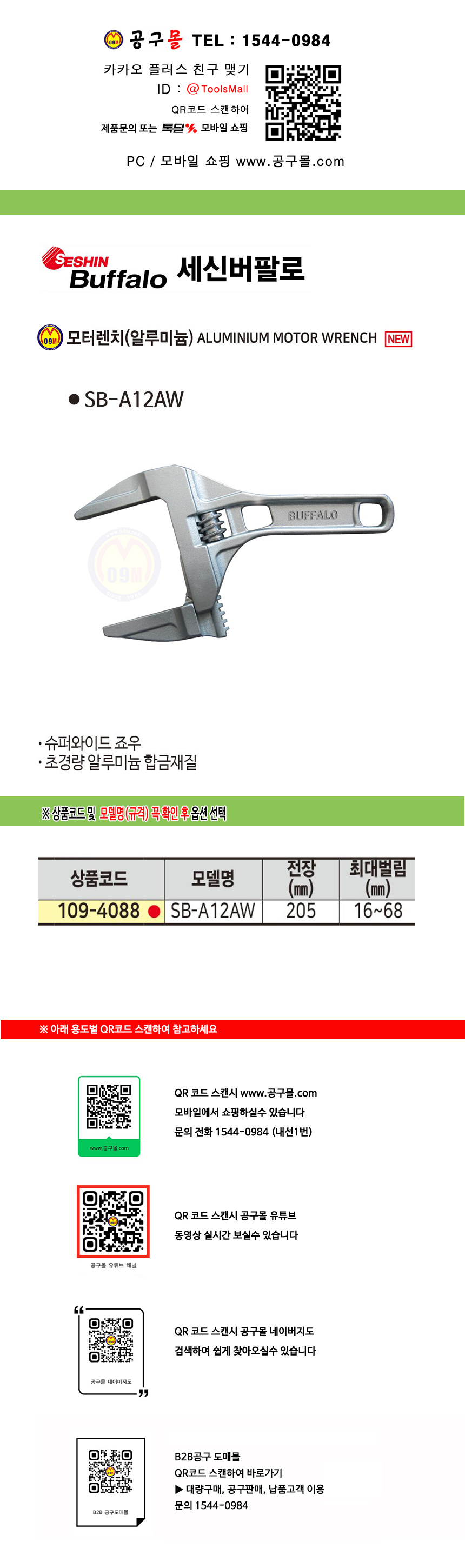 세신 모터렌치(알루미늄) SB-A12AW 몽키스패너, SESHIN BUFFALO, 세신공구, 버팔로 공구몰 109-4088