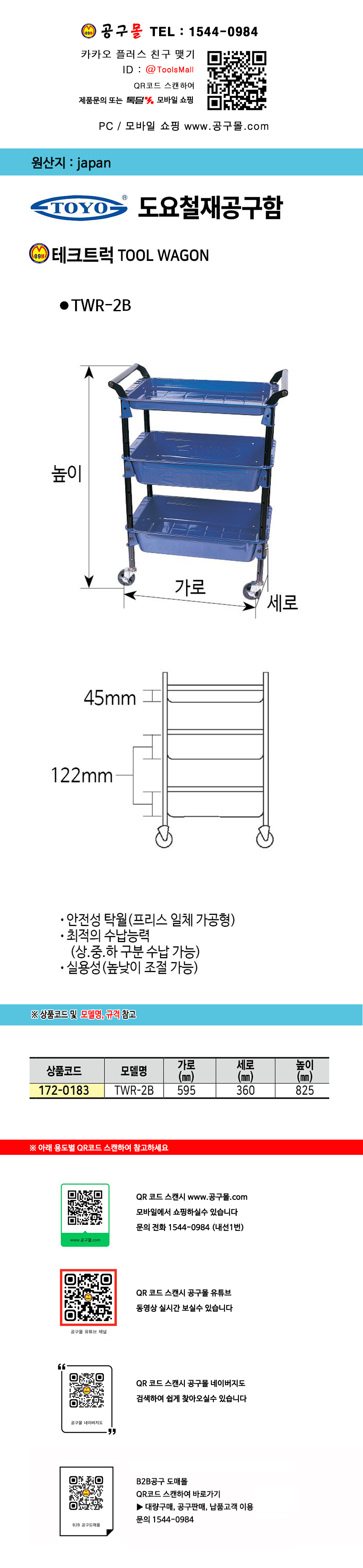 도요 테크트럭 TWR-2B (595x360x825mm) TOYO 일본산 공구함 172-0183