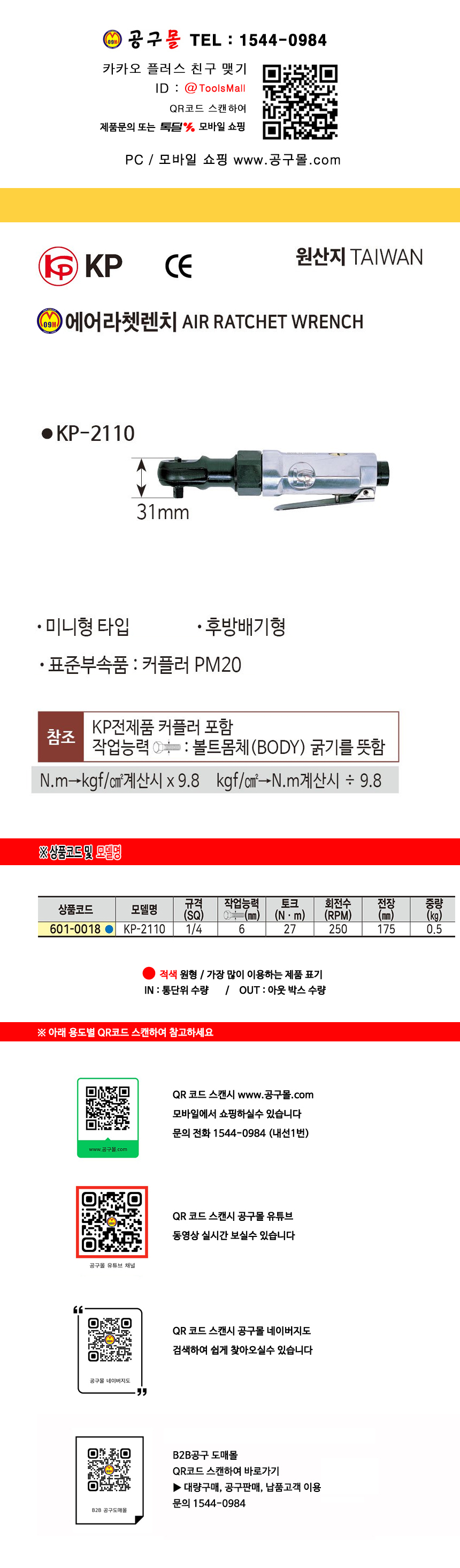KP 에어라쳇트렌치 KP-2110 (1/4SQ) 미니형 에어공구, 에어라체트 공구몰 601-0018