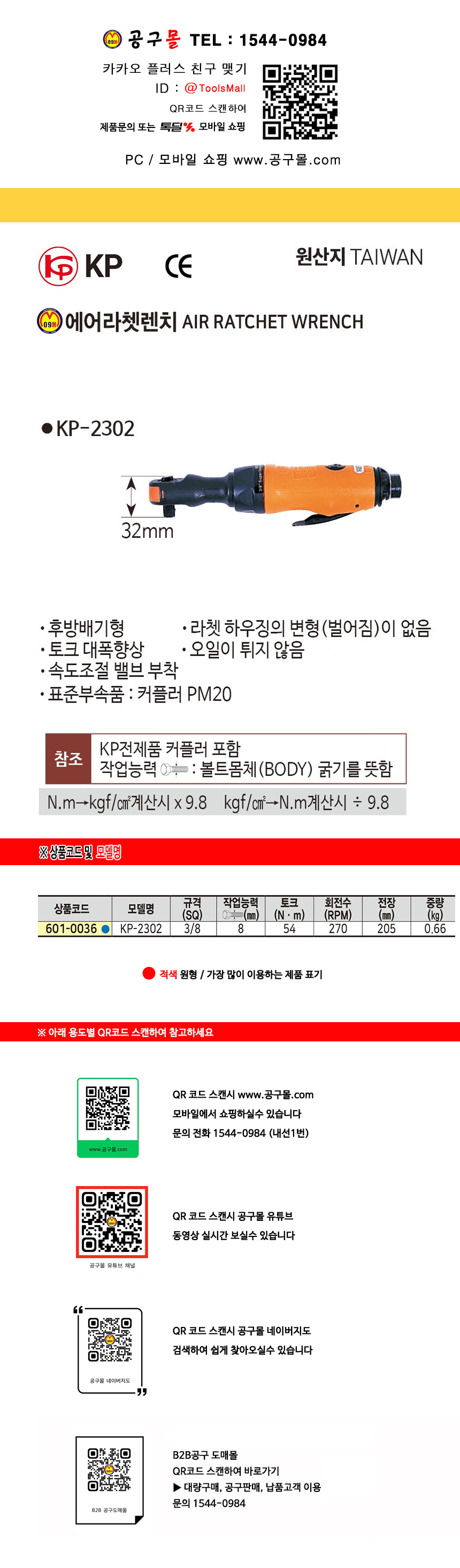 KP 에어라쳇트렌치 KP-2302 (3/8SQ) 에어공구, 에어라체트 공구몰 601-0036