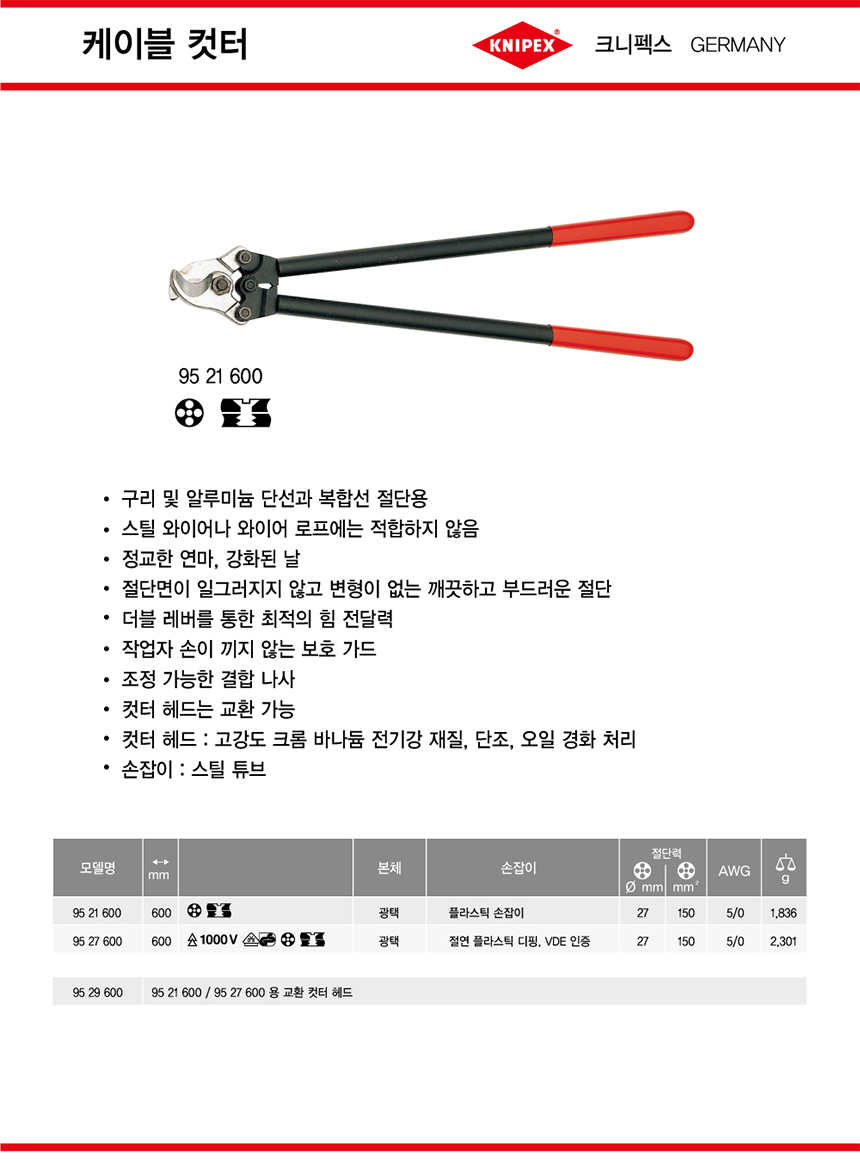 크니펙스 케이블컷터(단면,절연) 95-27-600 1000v 전선커터 KNIPEX 독일공구, 수공구, 공구몰추천 101011510027
