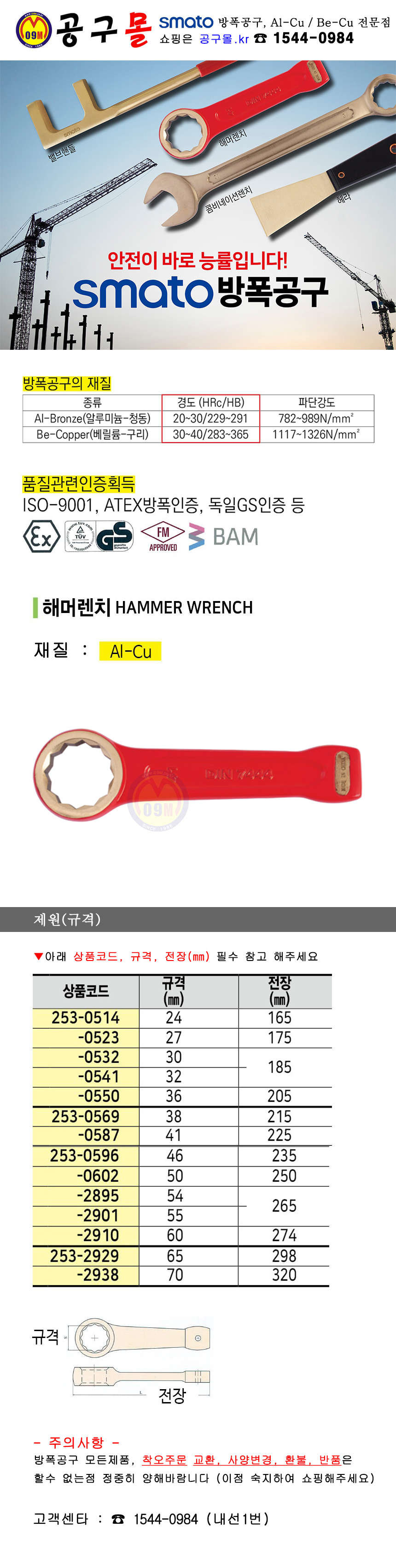 세신 해머렌치(방폭) AL-CU 38mm - 50mm SESHIN 버팔로, 방폭콤비스패너, 방폭렌치, 방폭공구, 공구몰 253-0587