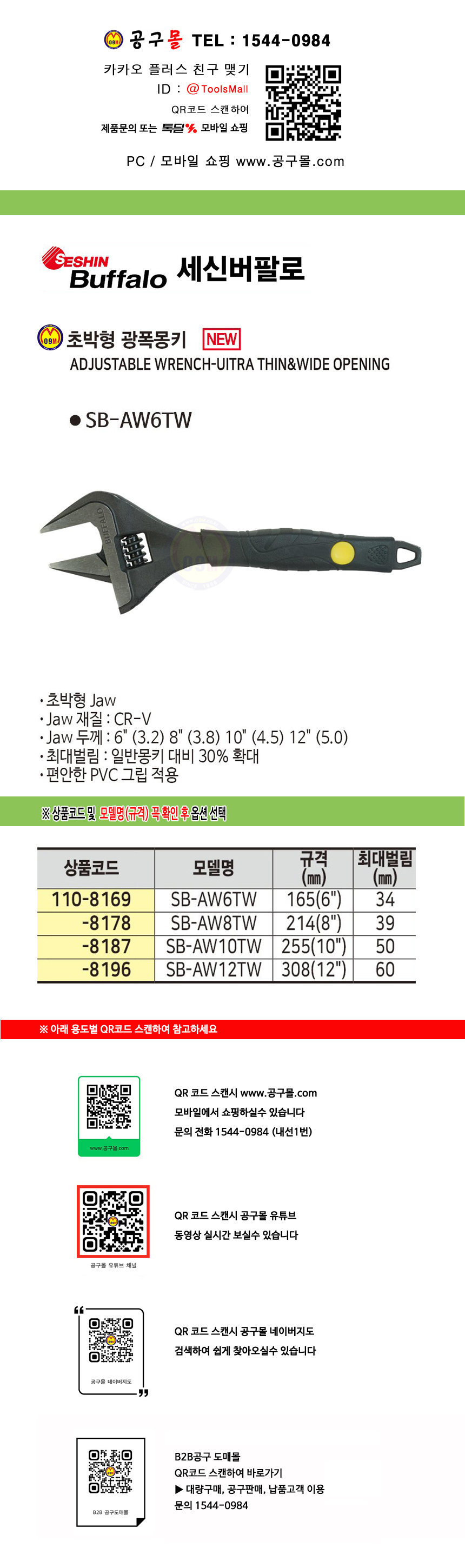 세신 초박형 광폭몽키 SB-AW10TW, SB-AW12TW 몽키스패너, SESHIN BUFFALO, 세신공구, 버팔로 공구몰 110-8187