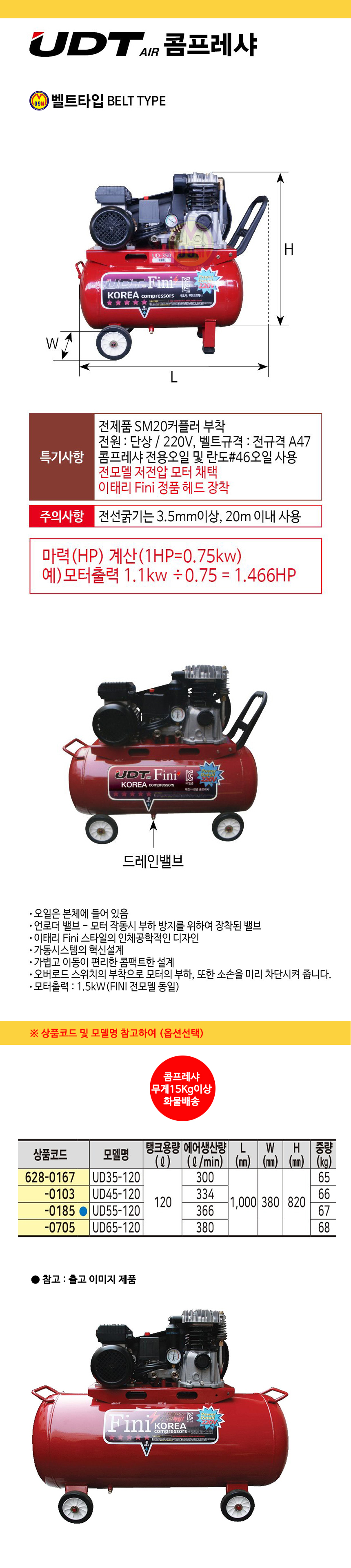 UDT 콤프레샤(벨트타입) UD35-120/ UD65-120 65Kg-68Kg 저소음콤프레샤 공구몰 628-0167
