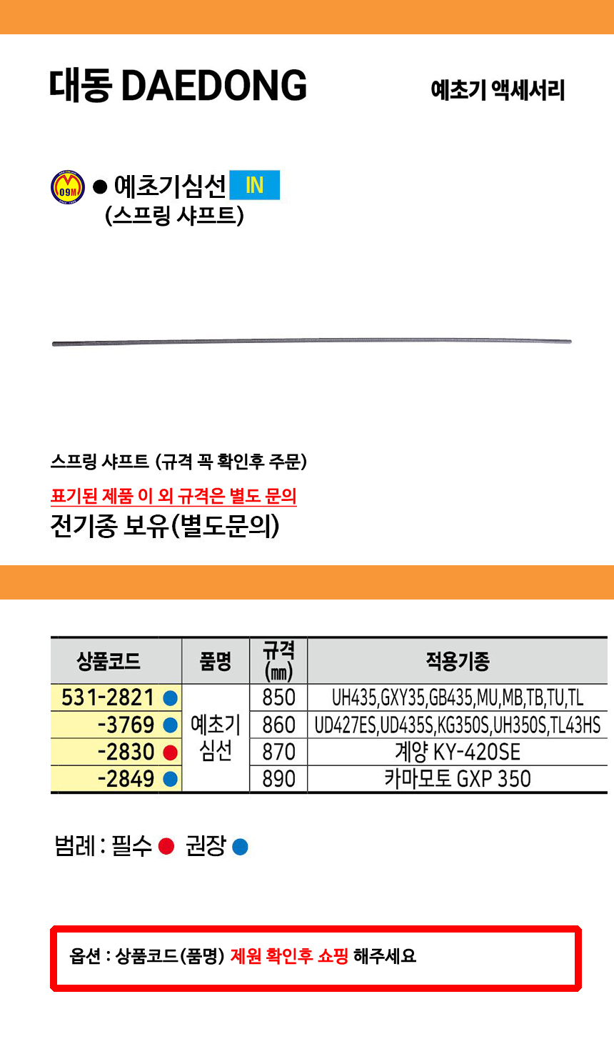 대동 예초기 심선 (스프링샤프트) 850mm/ 860mm/ 870mm/ 890mm 예초기부품, 공구몰 531-2821