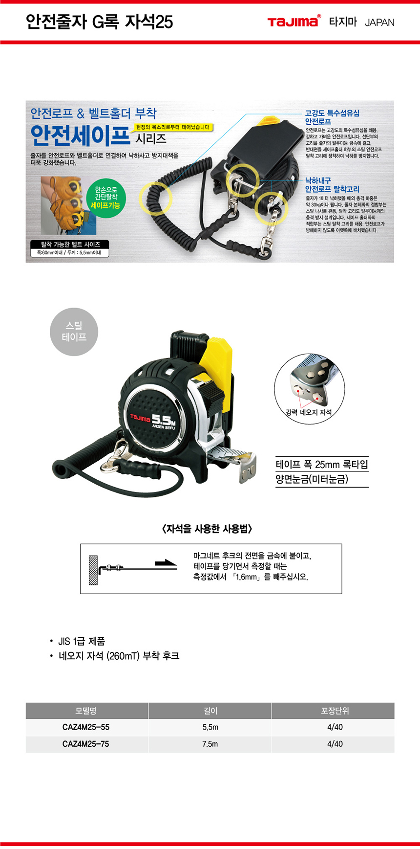 타지마 자동줄자(안전로프,GM) CAZ4M25-55BL, -75BL (5.5M,7.5M) TAJIMA 141402450123