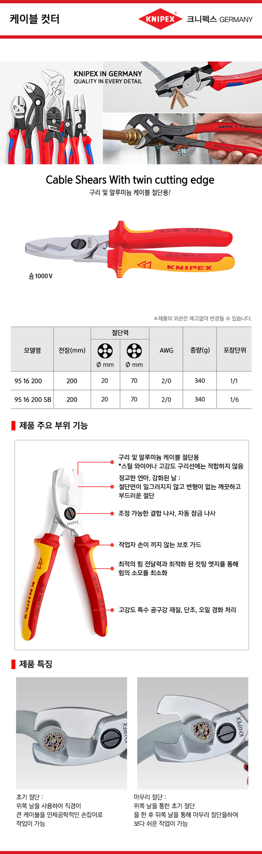 크니펙스 케이블컷터(단면,절연) 95-16-200, 95-16-200SB 전선커터 KNIPEX 독일공구, 수공구, 공구몰추천 101011510018