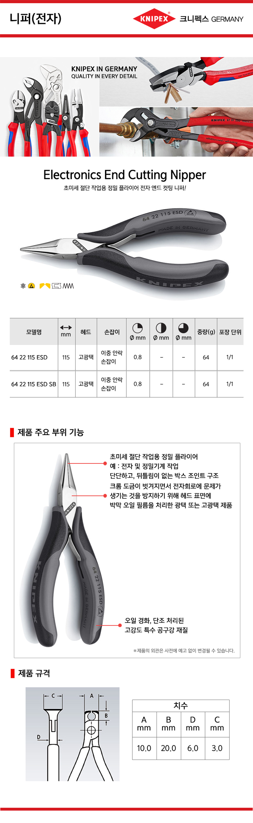 크니펙스 니퍼(전자) 64-22-115ESD, 64-22-115ESD-SB 전자니퍼 Knipex 독일공구, 공구몰추천 101001000030