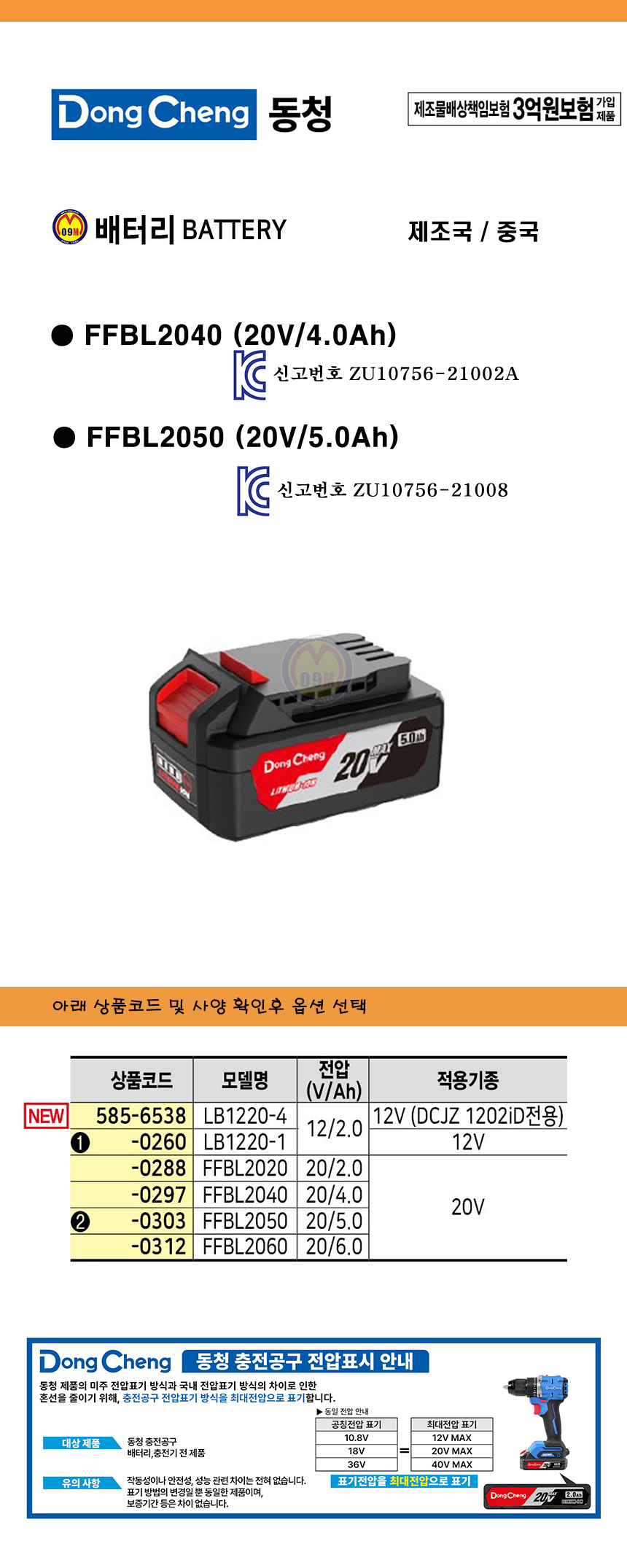 동청 배터리 FFBL2040(4.0Ah), FFBL2050(5.0Ah), 20V DongCheng 공구몰 585-0297
