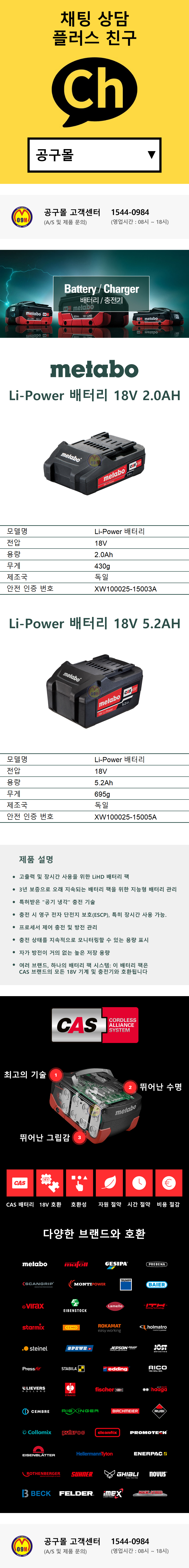 메타보 CAS 배터리 Li-Power 18V 2.0Ah 5.2Ah (타 브랜드 호환 가능)